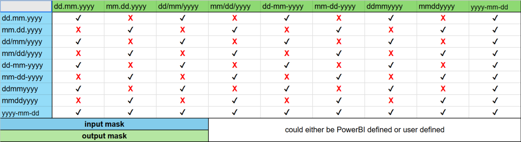 Users can enter dates using the selected Input mask, Output mask, or the default Power BI format. By default, both the Input mask and Output mask match the local date settings and the connected column’s format (Power BI format). While you can change the Input mask and Output mask independently for maximum flexibility, note that selecting an Input mask does not automatically update the Output mask.
